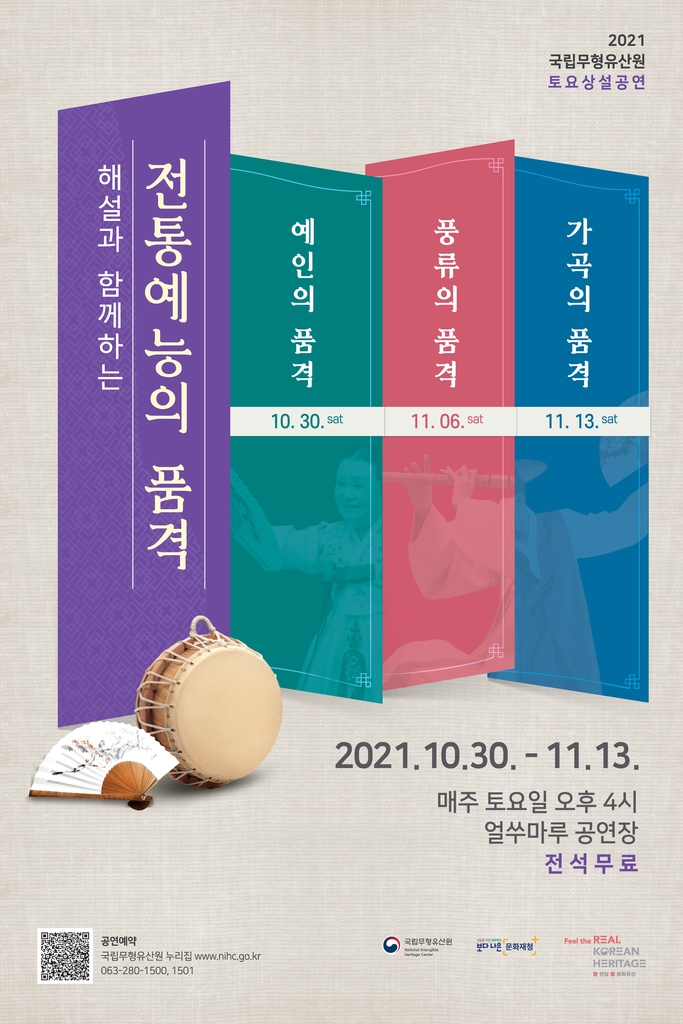 ▲ 국립무형유산원, '전통예능의 품격' 공연 = 국립무형유산원은 30일부터 다음 달 13일까지 매주 토요일 얼쑤마루 공연장에서 '해설과 함께하는 전통예능의 품격' 공연을 한다.