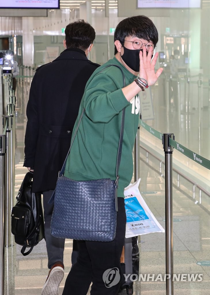 ▲ Yang Hyeon-jong of the Texas Rangers waves at Incheon International Airport in Incheon, just west of Seoul, on Feb. 20, 2021, before departing for the United States to join the club's spring training. (Yonhap)