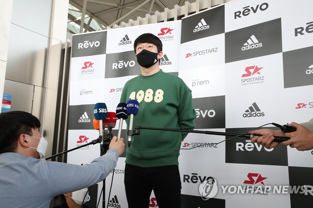 ▲ Yang Hyeon-jong of the Texas Rangers speaks to reporters at Incheon International Airport in Incheon, just west of Seoul, on Feb. 20, 2021, before departing for the United States to join the club's spring training. (Yonhap)