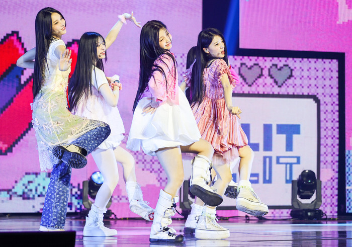 South Korean girl group ILLIT performs during a showcase for the group's debut mini album "Super Real Me" with title song "Magnetic" in Seoul on March 25, 2024. (Yonhap)