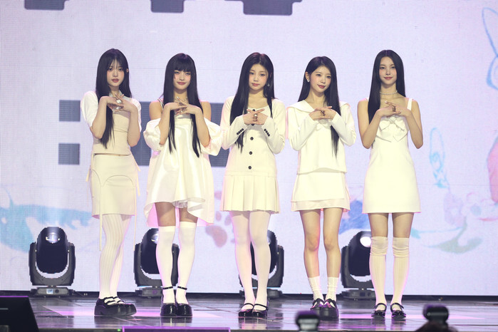 South Korean girl group ILLIT poses for a photo during a showcase for the group's debut mini album "Super Real Me" with title song "Magnetic" in Seoul on March 25, 2024. (Yonhap)