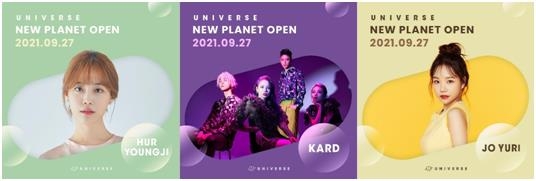 ▲ 가수 겸 배우 허영지, 혼성그룹 카드(KARD), 가수 조유리가 팬덤 플랫폼 유니버스에 27일 합류했다. 이들은 유니버스에 '플래닛'(아티스트별 공간)을 개설하고 팬들과 소통에 나선다. 이로써 유니버스를 이용하는 K팝 아티스트는 총 27팀으로 늘어났다. (서울=연합뉴스)
