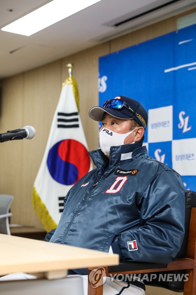 | ▲ Samsung Lions' manager Huh Sam-young speaks to reporters before Game 1 of the second round in the Korea Baseball Organization postseason against the Doosan Bears at Daegu Samsung Lions Park in Daegu, some 300 kilometers southeast of Seoul, on Nov. 9, 2021. (Yonhap) |