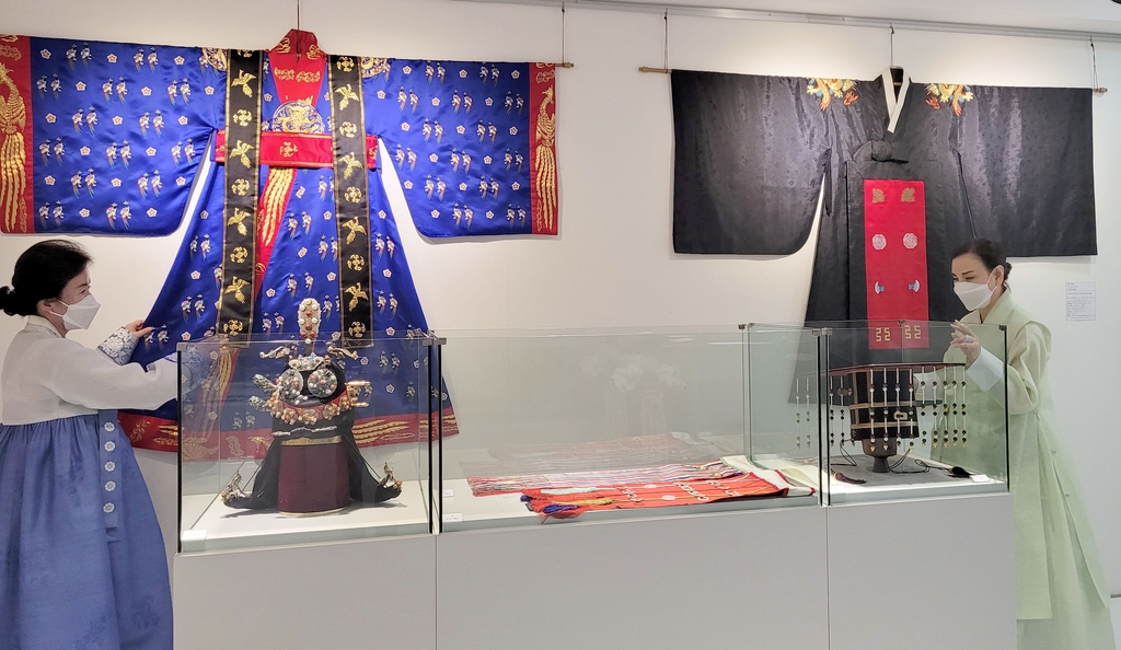이번 전시회에는 조선시대 왕과 왕비가 제례나 대례 등 왕궁 의례 행사에 착용한 면복, 왕이 직무를 볼 때 착용한 시무복, 왕비와 빈이 착용한 원삼 등이 출품됐다.