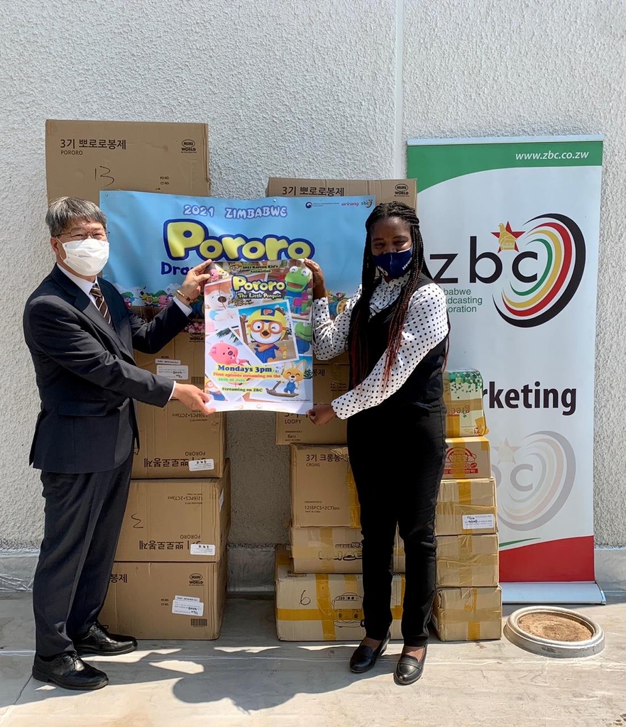 | ▲ 뽀로로 그리기 대회 입상자들을 위한 캐릭터 인형과 문구류 전달 (요하네스버그=연합뉴스) 도봉개(좌) 주짐바브웨 한국대사가 지난 8일 대사관과 아리랑방송의 공동후원으로 아델레이드 치쿵구루 ZBC 사장에게 뽀로로 인형과 문구류를 전달하고 있다. 2021.9.14 [주짐바브웨 한국대사관 제공, 재판매 및 DB 금지] |