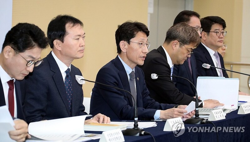 ▲ 부담금 정비 방안 브리핑 (세종=연합뉴스) 배재만 기자 = 김윤상 기획재정부 2차관(왼쪽 세 번째)이 26일 정부세종청사에서 국민ㆍ기업 부담 완화를 위한 '부담금 정비 방안'에 대해 관계 부처와 함께 설명하고 있다. 2024.3.27 scoop@yna.co.kr