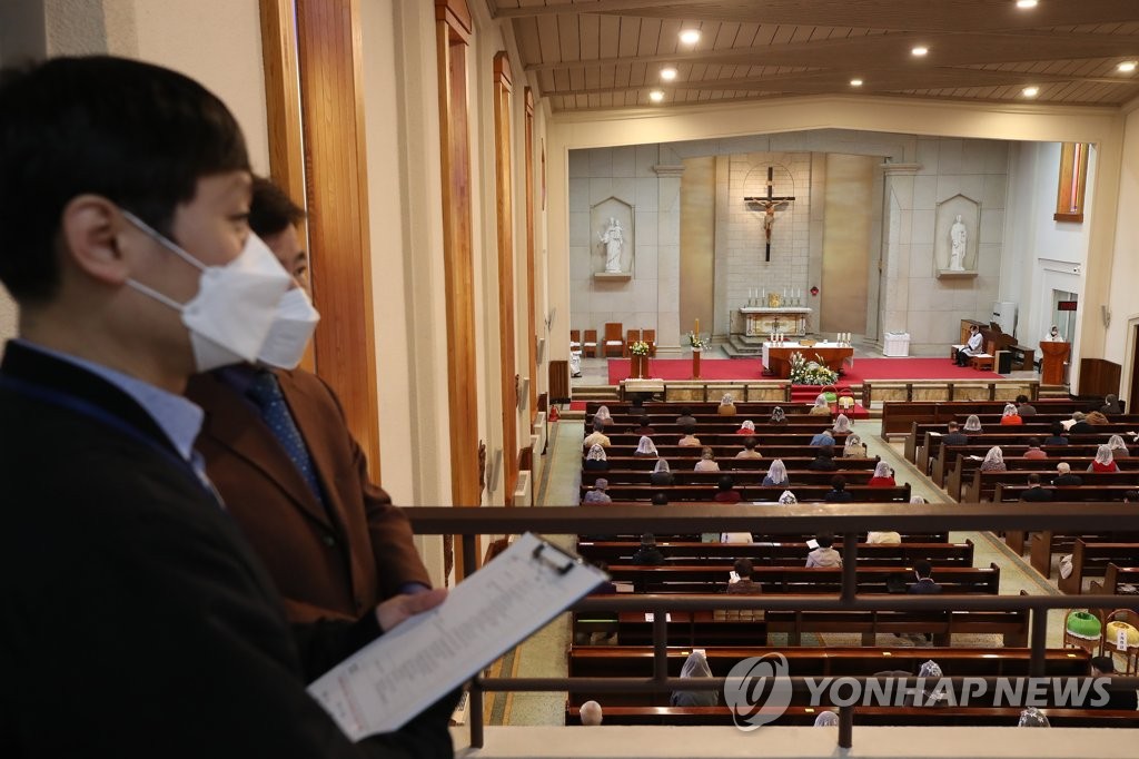 ▲ Seoul government officials check quarantine situations at a Catholic church in western Seoul on April 4, 2021, as worshipers participate in Easter Mass amid the pandemic. (Yonhap)