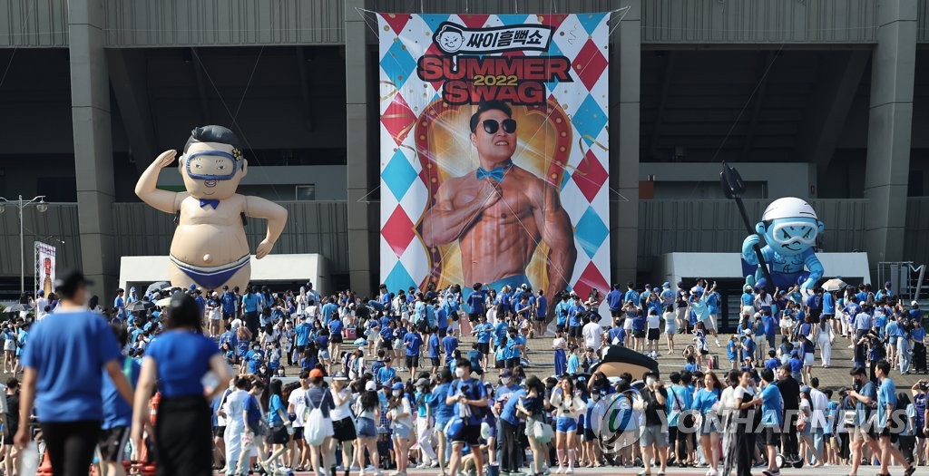 | ▲ 싸이 흠뻑쇼 관람 인파 (서울=연합뉴스) 홍해인 기자 = 15일 서울 송파구 잠실 올림픽주경기장에서 열리는 가수 싸이의 콘서트 '싸이흠뻑쇼 2022'를 찾은 관객들이 경기장 일대를 오가고 있다. 2022.7.15 hihong@yna.co.kr |