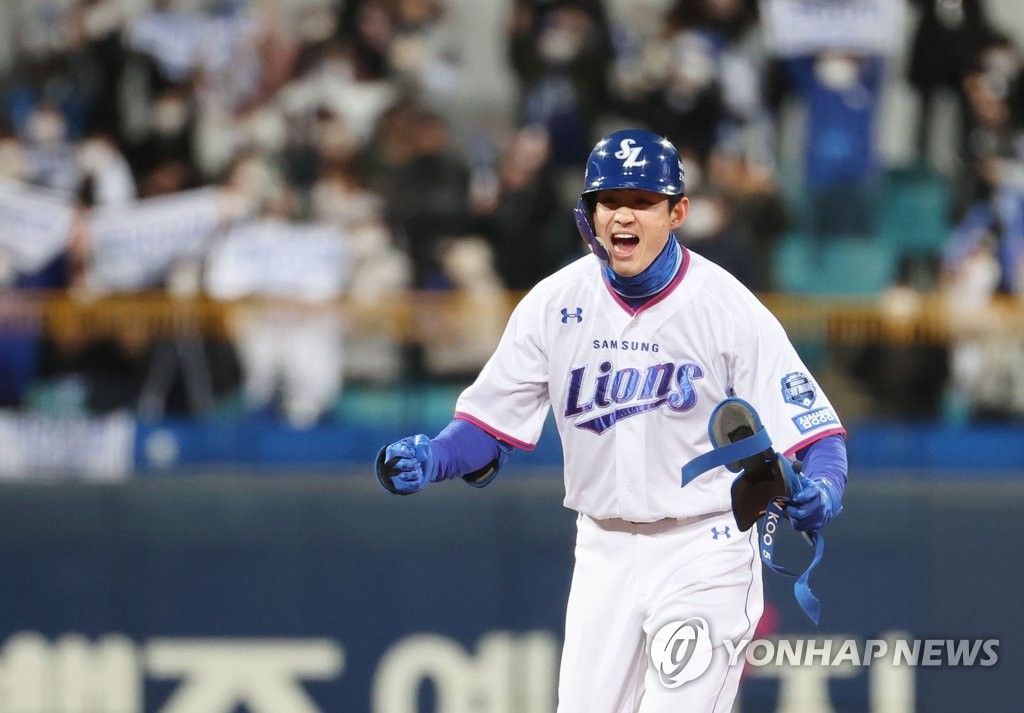 | ▲ Koo Ja-wook of the Samsung Lions celebrates his RBI double against the Doosan Bears in the bottom of the first inning during Game 1 of the second round in the Korea Baseball Organization postseason at Daegu Samsung Lions Park in Daegu, some 300 kilometers southeast of Seoul, on Nov. 9, 2021. (Yonhap) |