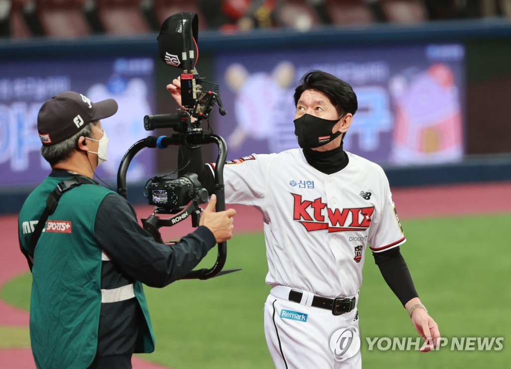 | ▲ KT Wiz manager Lee Kang-chul (R) salutes the crowd after beating the Doosan Bears 4-2 in Game 1 of the Korean Series at Gocheok Sky Dome in Seoul on Nov. 14, 2021. (Yonhap) |