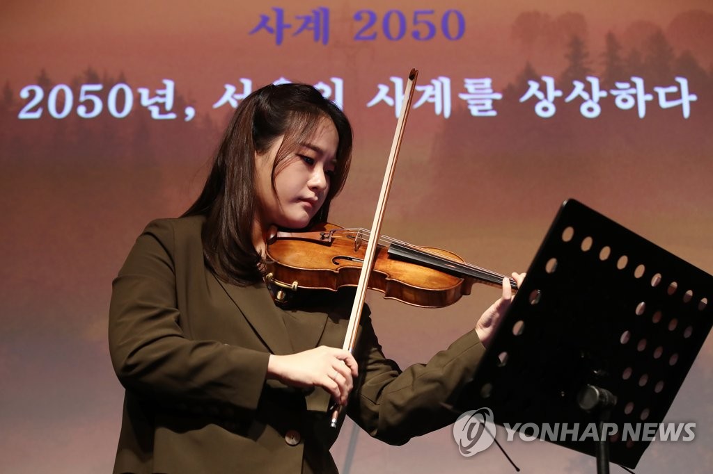 | ▲ AI가 편곡한 '2050년 미래버전 사계' (서울=연합뉴스) 진연수 기자 = 바이올리니스트 임지영이 12일 오후 서울 강남구 오드포트에서 열린 기후위기 대응을 위한 글로벌 인공지능(AI) 프로젝트 '사계 2050' 기자간담회에서 AI가 편곡한 비발디의 사계를 연주하고 있다. 2021.10.12 jin90@yna.co.kr |