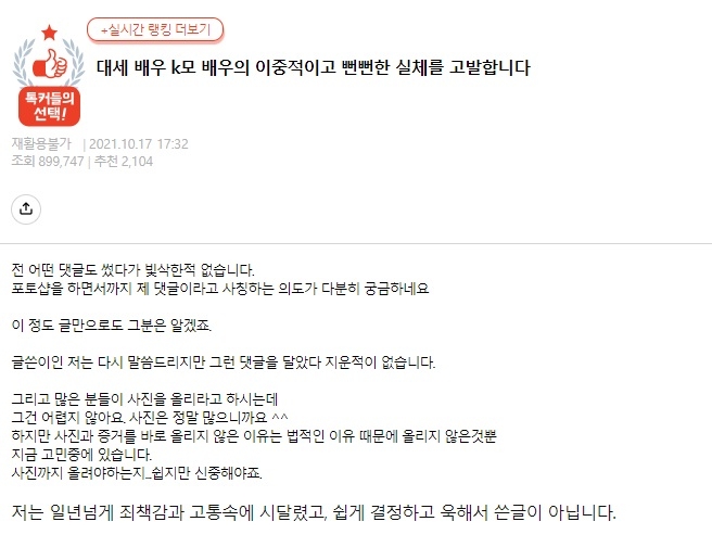 18일 방송가에 따르면 전날 한 온라인 커뮤니티에는 '대세 배우 K모 배우의 이중적이고 뻔뻔한 실체를 고발합니다'라는 제목의 글이 올라왔다.
