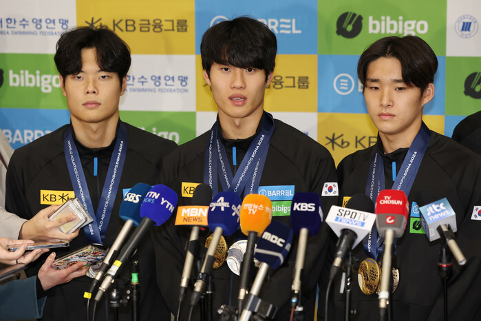 Hwang Sun-woo (C) of South Korea, who won the gold medal in the men's 200-meter freestyle title at the just-ended World Aquatics Championships in Doha, meets the press with his teammates upon returning home via Incheon International Airport, west of Seoul, on Feb. 19, 2024. (Yonhap)