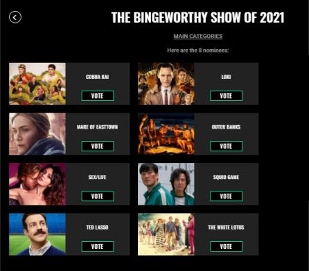 '오징어 게임'은 TV 섹션의 '올해의 몰아볼 만한 쇼'(The Bingeworthy Show of 2021) 부문 후보로 선정됐다.