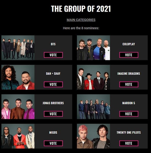 | ▲ 미국 '피플스 초이스 어워즈' 올해의 그룹 후보 [피플스 초이스 어워즈 홈페이지 캡처] |