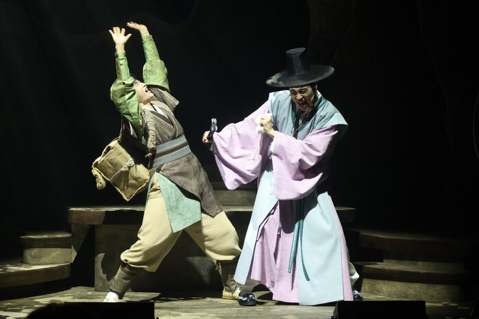 South Korean actors Ryu Chan-yeol (L) and Jo Hoon, who star in the new musical "Here, Pihwadang," perform during a publicity event in Seoul on Feb. 15, 2024. The musical runs until April 14. (Yonhap)