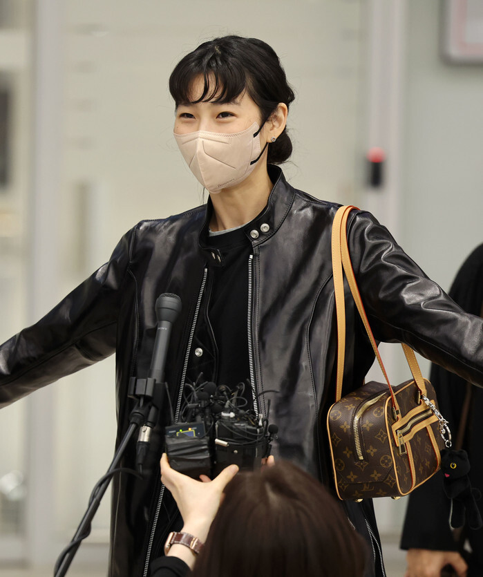Actress Jung Ho-yeon of "Squid Game" poses for a photo upon returning home at Incheon International Airport, west of Seoul on Sept. 15, 2022. The megahit Korean-language Netflix original series won best director and best actor awards at the 74th Emmy Awards in Los Angeles on Sept. 12. (Yonhap)