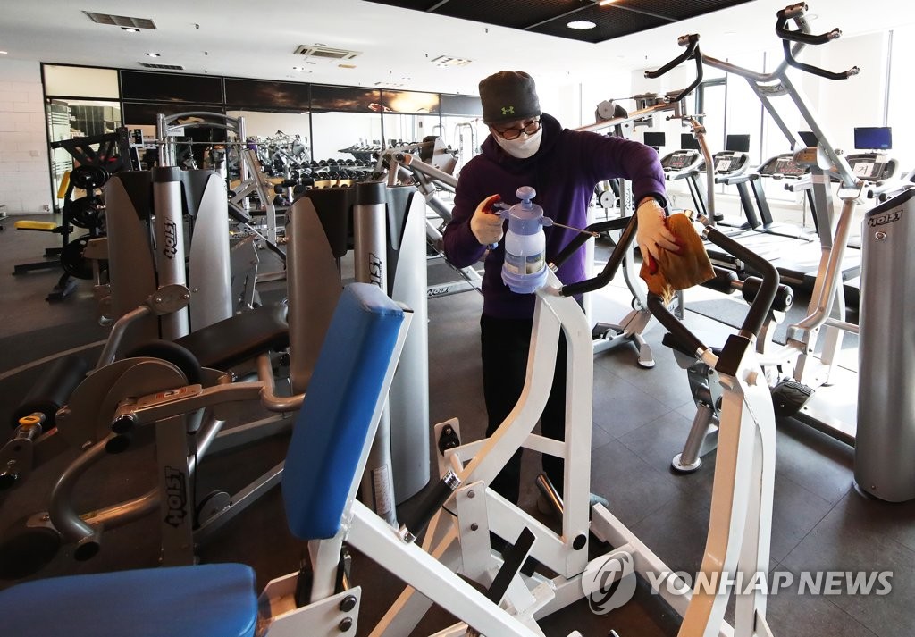 ▲ An employee at a gym in Yongin, south of Seoul, disinfects fitness equipment on Jan. 17, 2021, to prepare for opening as the government eases restrictions on indoor sports facilities. (Yonhap)