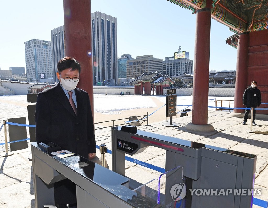 | ▲ This photo taken Feb. 4, 2021, and provided by the Cultural Heritage Administration shows a man passing through a noncontact entrance system at Gyeongbok Palace in central Seoul amid the COVID-19 pandemic. (PHOTO NOT FOR SALE) (Yonhap) |