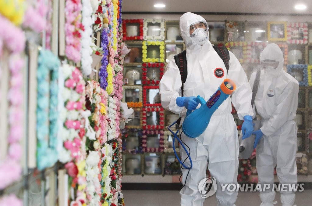 ▲ Health workers disinfect a charnel facility in Suwon, south of Seoul, on Sept. 14, 2021. (Yonhap)