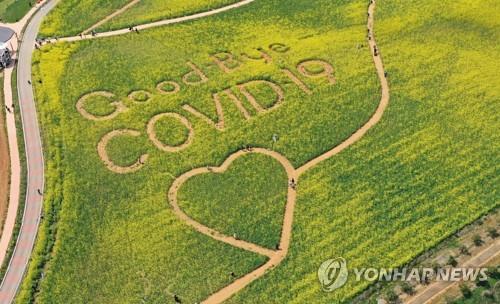 | ▲ This bird eye's view shot of Anseong Farmland park in Gyeonggi Province on April 18, 2021, shows visitors at the park's flower field with the phrase "Good Bye COVID-19." (Yonhap) |