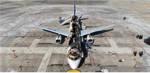 | ▲ A fire-damaged airplane stands at Gimhae International Airport in Busan, some 320 kilometers southeast of Seoul, on Jan. 30, 2025, in this photo provided by the transportation ministry. (PHOTO NOT FOR SALE) (Yonhap) |