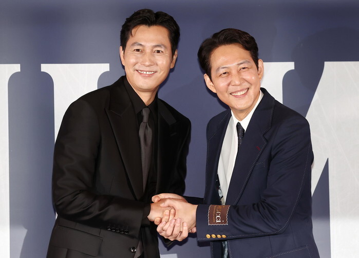 South Korean actors Lee Jung-jae (R) and Jung Woo-sung, who star in the new movie "Hunt," pose for a photo during a publicity event in Seoul on July 27, 2022. The movie will be released in South Korea on Aug. 10. (Yonhap)