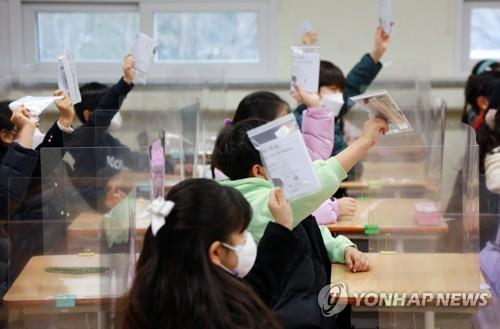 | ▲  Elementary school students in South Korea's southeastern city of Daegu show COVID-19 self-test kits they received from their teacher on March 2, 2022. (Yonhap) |