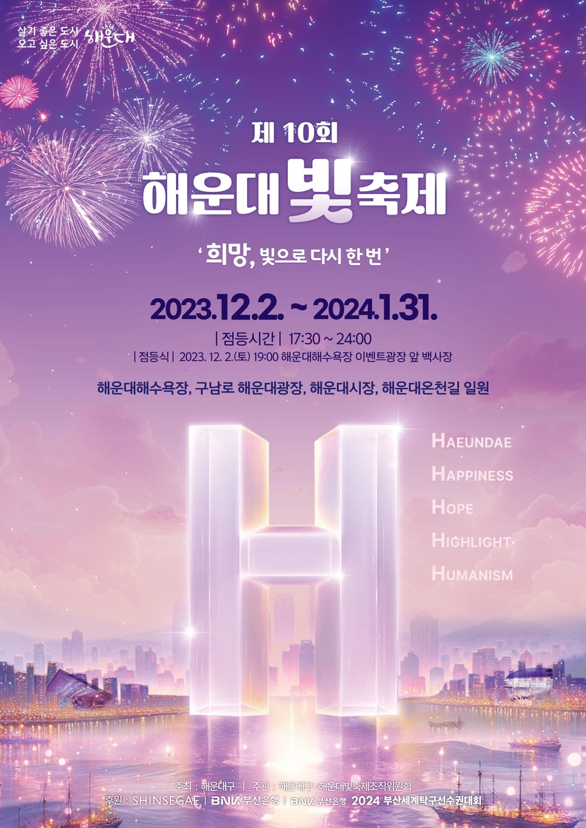 해운대해수욕장 '빛의 절정', 구남로 '행복', 해운대시장 '인류애', 온천길 '희망' 등 구간별로 주제에 어울리는 빛 조형물과 포토존으로 꾸며진다.