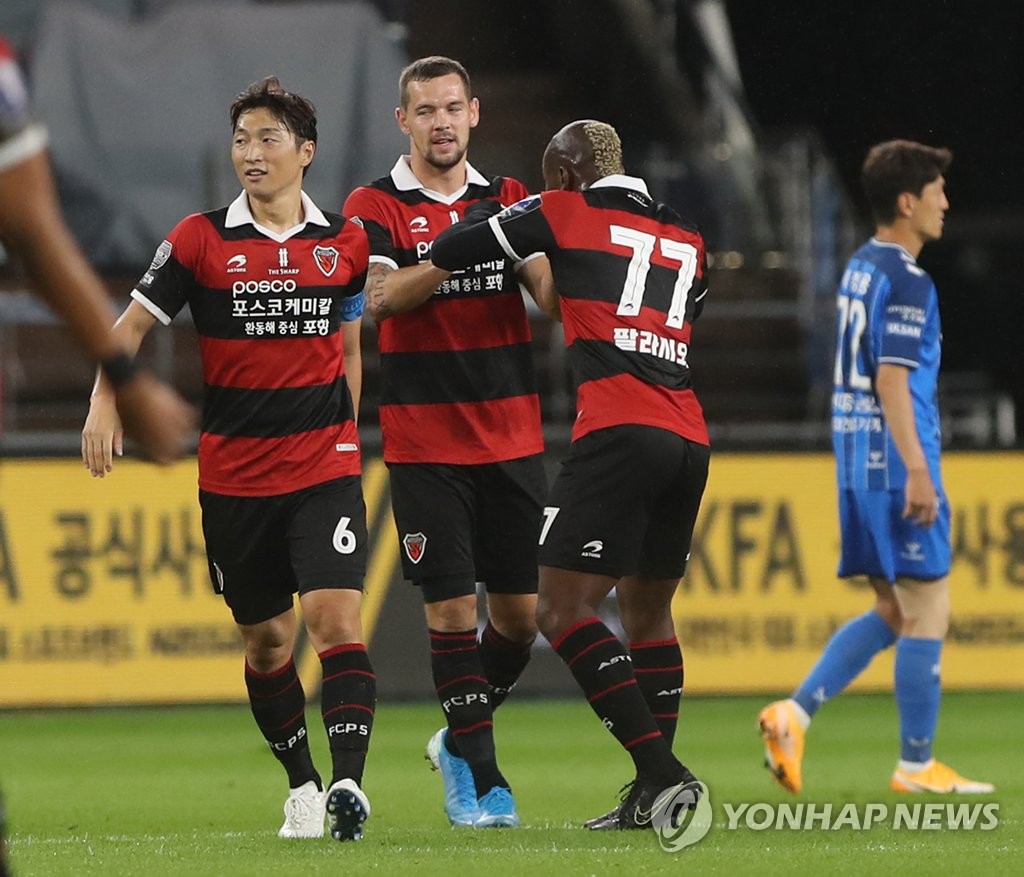 | ▲ This file photo from Sept. 23, 2020, shows Pohang Steelers players celebrating an own goal by Ulsan Hyundai FC during the semifinals of the FA Cup tournament at Ulsan Munsu Football Stadium in Ulsan, 415 kilometers southeast of Seoul. (Yonhap) |