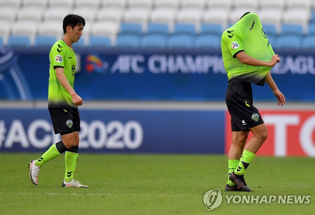 | ▲ In this EPA file photo from Dec. 1, 2020, Jeonbuk Hyundai Motors' players react to their 4-1 loss to Yokohama F. Marinos in their Group H match at the Asian Football Confederation Champions League at Al Janoub Stadium in Al Wakrah, Qatar. (Yonhap) |