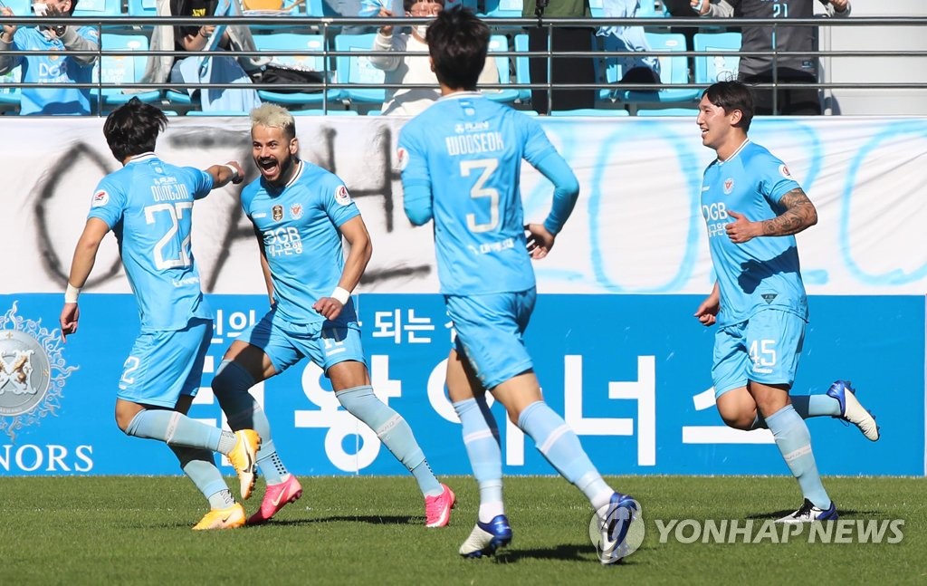 | ▲ This file photo from Oct. 25, 2020, shows Daegu FC players celebrating a goal by Cesinha (2nd from L) against Pohang Steelers during a K League 1 match at DGB Daegu Bank Park in Daegu, 300 kilometers southeast of Seoul. (Yonhap) |
