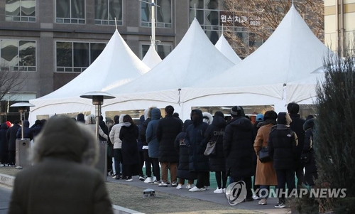 | ▲ People wait in line to get COVID-19 tests at a makeshift virus testing clinic in Seoul on Dec. 26, 2021. (Yonhap) |