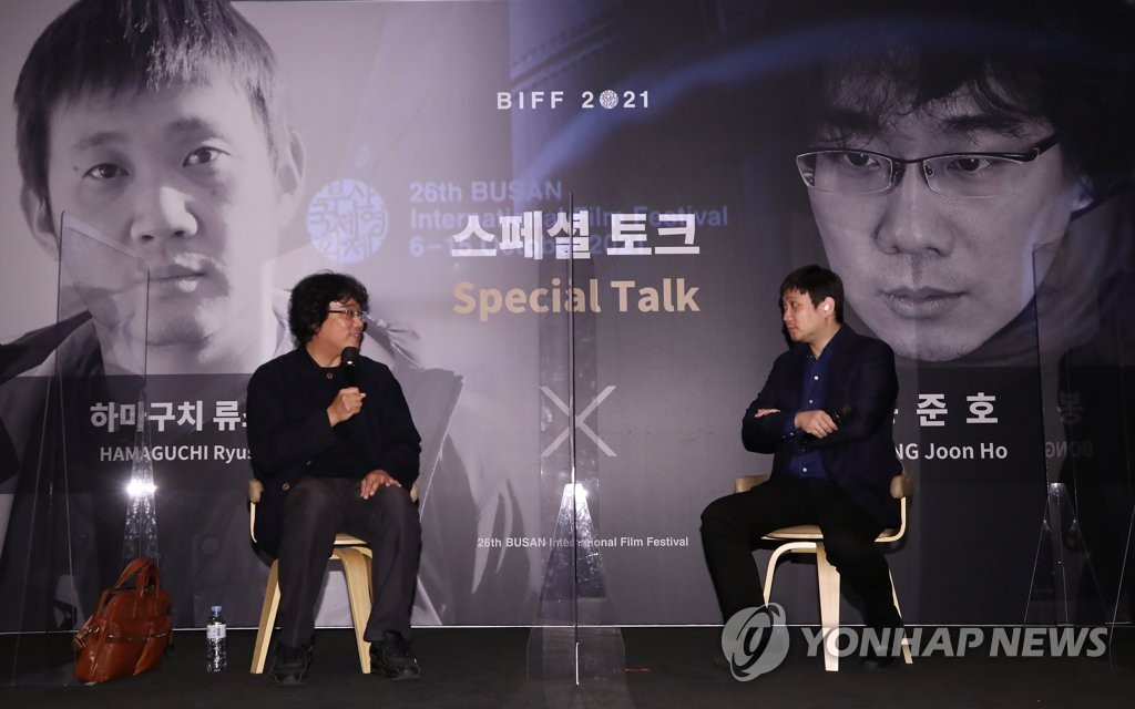 | ▲ 대화 나누는 봉준호-하마구치 류스케 (부산=연합뉴스) 진연수 기자 = 봉준호 감독(왼쪽)과 하마구치 류스케 감독이 7일 오후 부산 해운대구 영화의전당 중극장에서 열린 제26회 부산국제영화제(BIFF) 스페셜 대담에서 대화하고 있다. 2021.10.7 jin90@yna.co.kr |