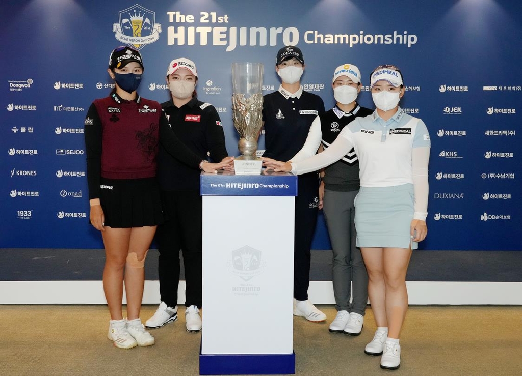 | ▲ 기념사진 찍는 하이트진로 챔피언십 출전 선수들 왼쪽부터 박현경, 장하나, 박성현, 박민지, 이다연 [하이트진로 챔피언십 제공. 재판매 및 DB 금지] |