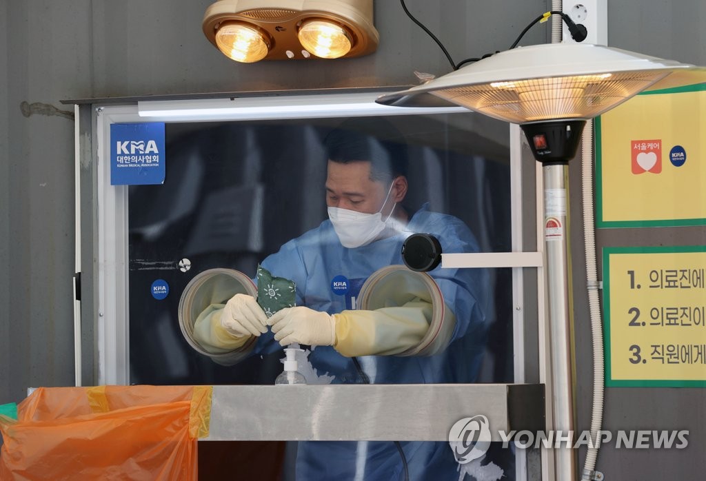 ▲ A health worker collects a sample from a citizen at a makeshift virus testing clinic in Seoul on Jan. 19, 2021. (Yonhap)