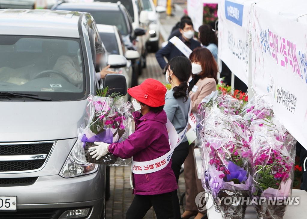 ▲ A driver buys a box of flowers at a drive-thru flower shop at Seongnam City Hall in Gyeonggi Province, south of Seoul, on April 13, 2021. (Yonhap)