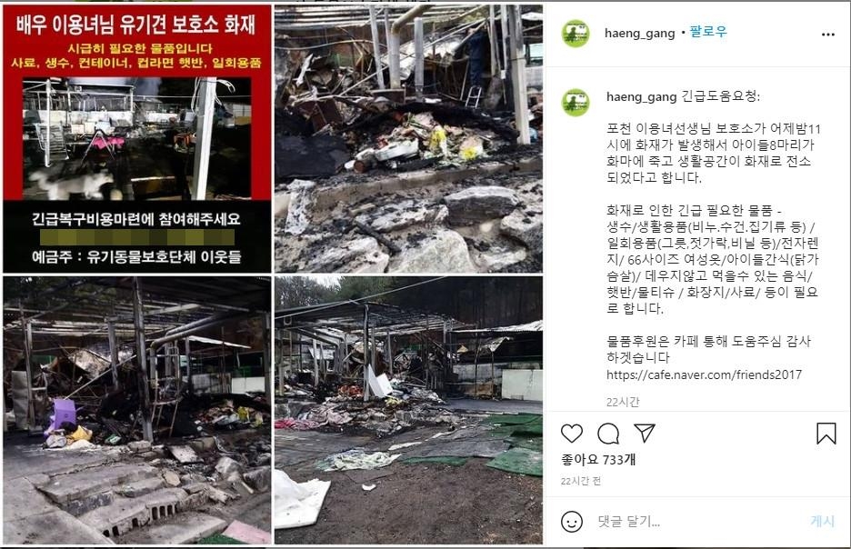 | ▲ 배우 이용녀씨 유기견 보호소 화재 [사단법인 동물보호단체 '행강'의 인스타그램 갈무리. 재판매 및 DB금지] |
