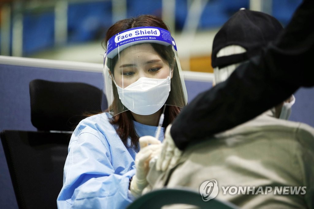 ▲ A medical worker administers a Pfizer COVID-19 vaccine shot at a vaccination center in Gwangju, 329 kilometers south of Seoul, on April 30, 2021, in this photo provided by the city's Buk District office. (PHOTO NOT FOR SALE) (Yonhap)