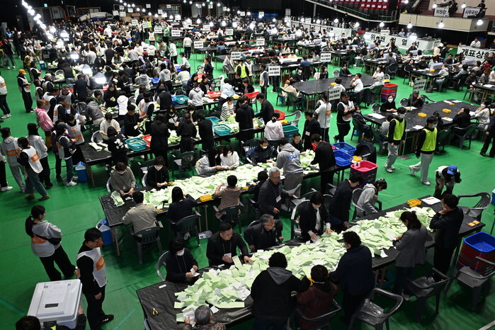 Work to count ballots begins at a ballot counting station set up at a gym on the country's southern Jeju Island on April 10, 2024, as the general elections to choose 300 lawmakers ended at 6 p.m. (Pool photo) (Yonhap)