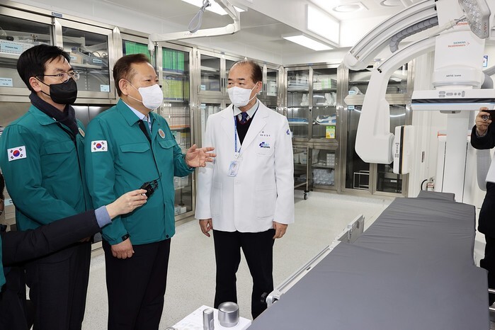 Interior Minister Lee Sang-min (C) inspects an emergency treatment system during a visit to a hospital in Gimcheon, about 230 kilometers southeast of Seoul, on Feb. 23, 2024, amid chaos nationwide resulting from collective action by nearly 9,000 trainee doctors, in this photo provided by the interior ministry. (PHOTO NOT FOR SALE) (Yonhap)