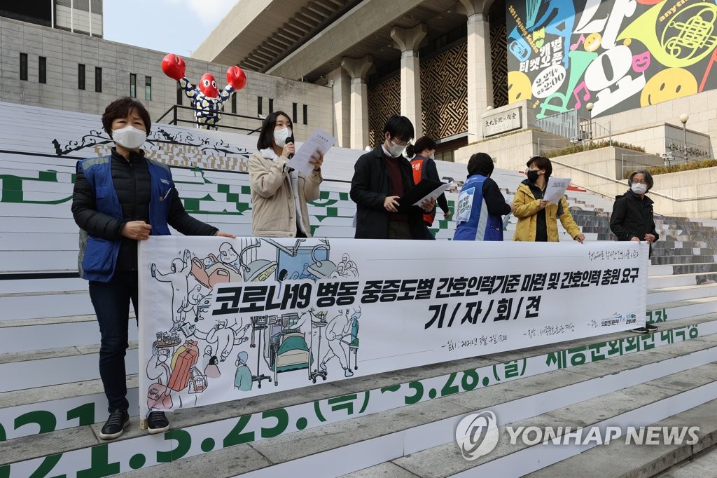 ▲ This photo taken on March 7, 2021, shows medical workers holding a press conference in front of Sejong Cultural Center in central Seoul for an increase in the medical workforce amid the extended coronavirus pandemic. (Yonhap)
