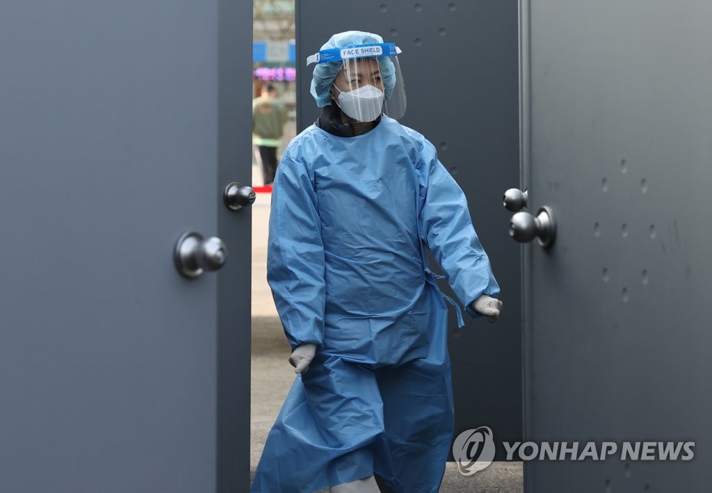 ▲ This photo taken on March 7, 2021, shows a medical worker walking out of a coronavirus testing center at Seoul Station in central Seoul. (Yonhap)