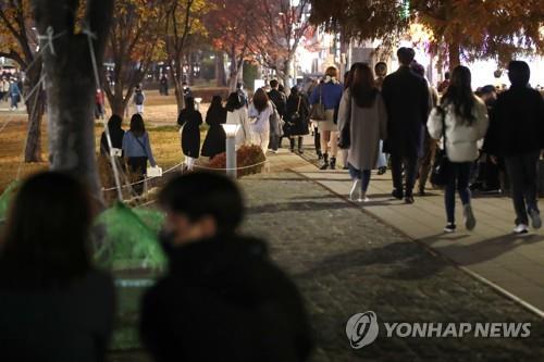 ▲ A street in the Mapo district in Seoul is crowded with people on Nov. 18, 2021. (Yonhap)