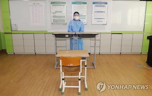 | ▲ A proctor in full protective gear rehearses to supervise the college entrance test at a classroom for test-takers with COVID-19 symptoms at Areum High School in Sejong, central South Korea, on Nov. 16, 2021, two days before the test to be taken by 509,821 students nationwide amid the pandemic. (Yonhap) |