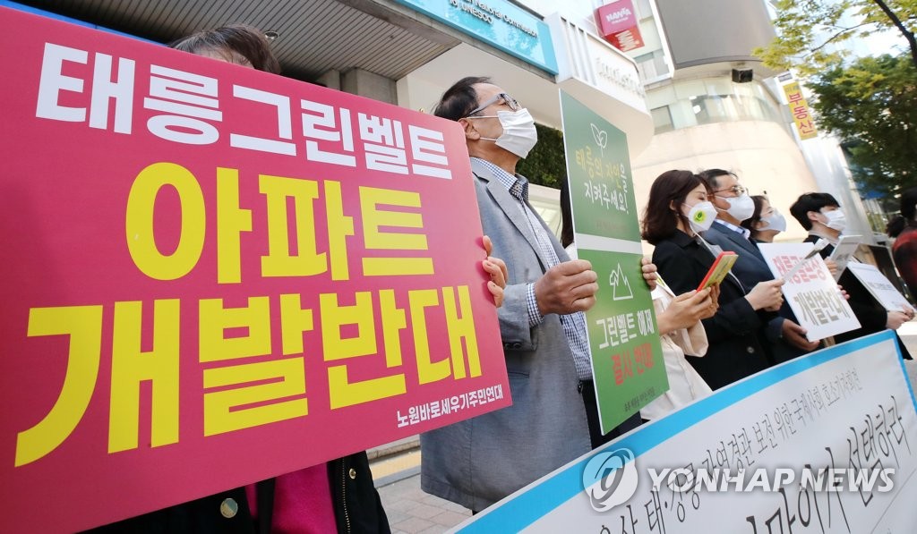 | ▲ '태릉 그린벨트 아파트 개발 반대' 지난해 10월 8일 서울환경운동연합과 초록태릉을지키는시민들이 진행한 기자회견. [연합뉴스 자료사진] |