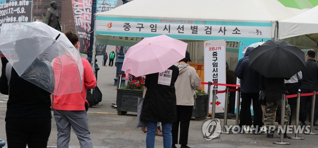 | ▲ Citizens wait in line to receive COVID-19 tests at a makeshift clinic in central Seoul on April 29, 2021. (Yonhap) |