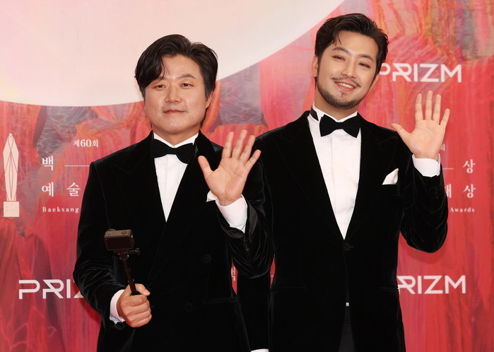 South Korean producer Na Young-suk (L) and entertainer Lee Byung-gun pose for a photo at the 60th Baeksang Arts Awards ceremony in Seoul on May 7, 2024. (Yonhap)