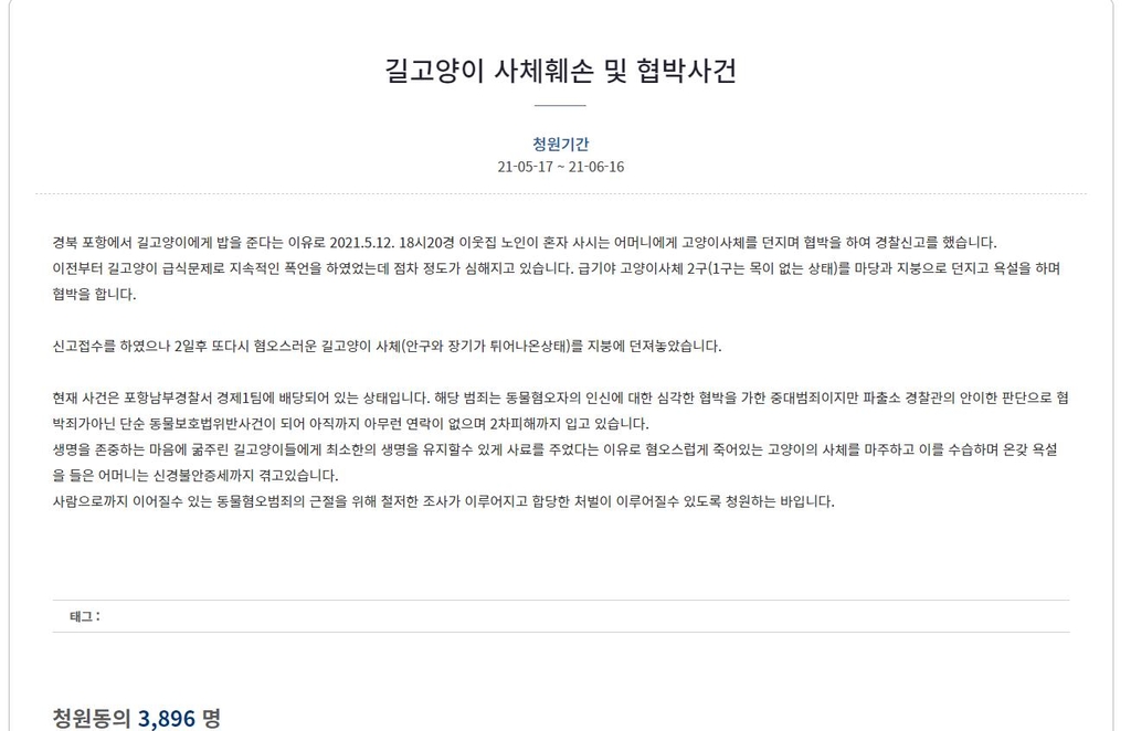 "포항 길고양이 사체 훼손 조사" 청와대 국민청원