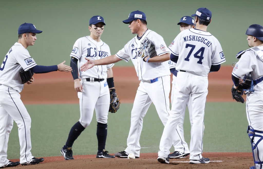 | ▲ 세이부 동료들과 악수하는 마쓰자카 (도코로자와 교도=연합뉴스) 세이부 라이언스 우완 투수 마쓰자카 다이스케가 19일 일본 사이타마현 도코로자와시 메트라이프돔에서 열린 일본프로야구 닛폰햄 파이터스와의 은퇴 경기에서 한 타자와의 승부(볼넷)를 마친 뒤, 팀 동료들과 악수하고 있다. |